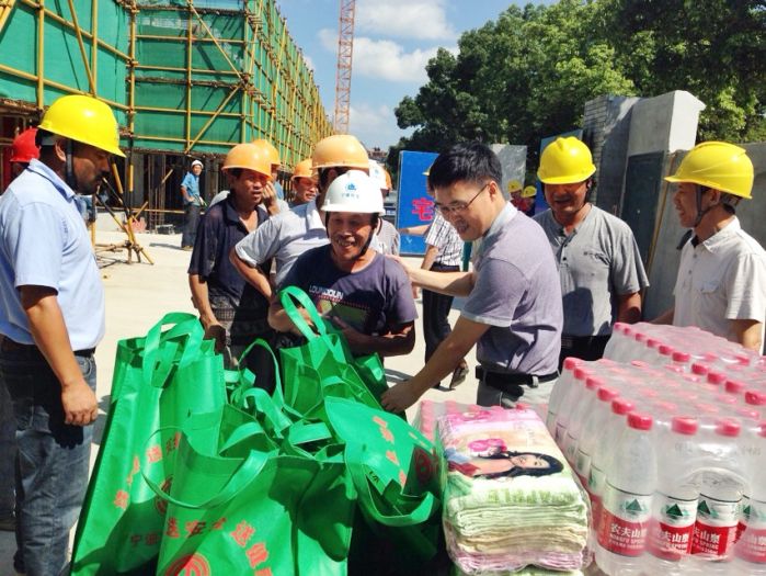 時值酷暑,近日寧波市總工會副主席魯煥清等一行來到東錢湖萬金人家安置小區項目部,給高溫中辛勤工作的務工人員送去西瓜、毛巾、藿香正氣水等防暑用品。詢問了解務工人員工作狀況,叮囑他們勞逸結合,提高安全意識。