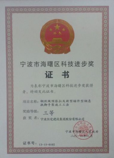 2015年10月,根據《關于做好2015年度海曙區科學技術獎推薦和申報工作的通知》有關規定,我集團公司及時完善申報資料并取得第三方認證機構寧波市科技信息研究院的查新認證。在區住建局推薦申報的基礎上,經區科學技術獎評審委員會評審,并報區政府常務會議審議同意,我集團公司《鋼絲繩預張拉及新型錨件型鋼懸挑腳手架施工工法》獲得海曙區科學技術進步獎。