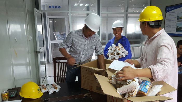 發月餅的時候,一位帶班拿著剛剛領到月餅高興的說:“感謝領導、感謝公司對我們無微不至的關懷,夏天送清涼,節日送祝福,讓我們從心里感受到了家的溫暖,有了回家的感覺。”項目負責親切地對大家說:“兄弟們,辛苦你們了!不能回家和家人團圓,在現場你們一定要注意安全, 你們的平安就是給家里最好的消息,大家要開開心心工作,快快樂樂過節!”