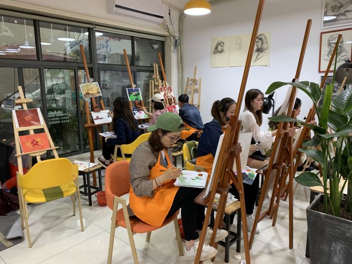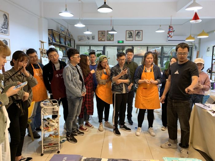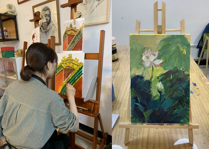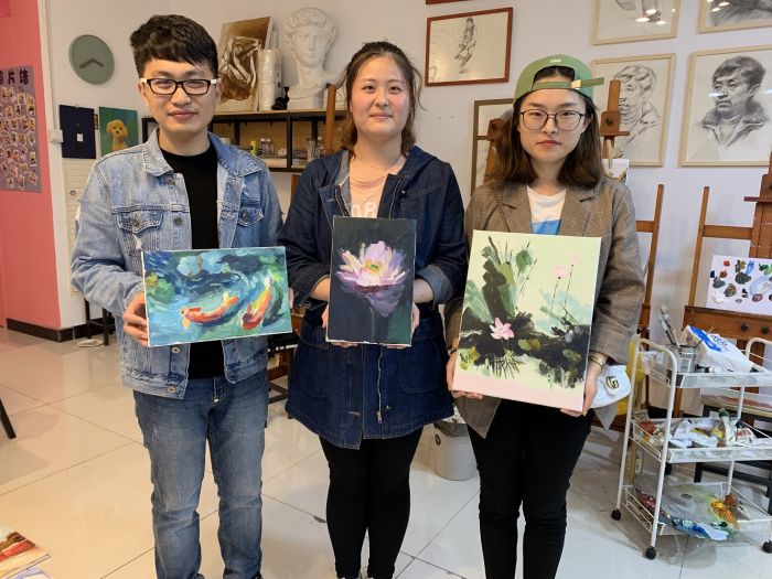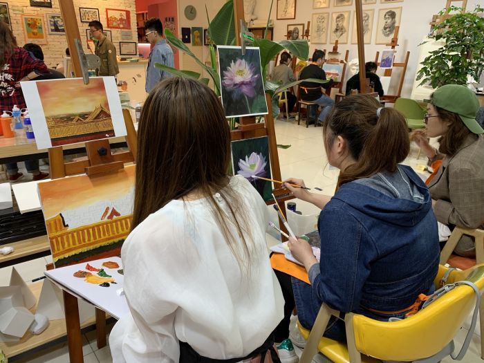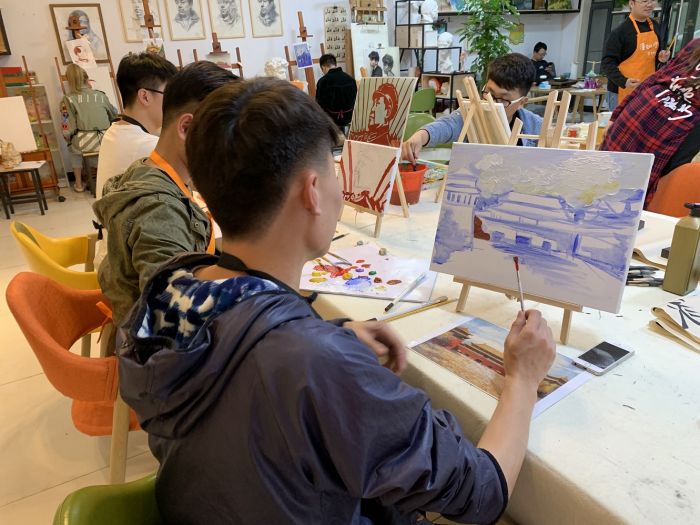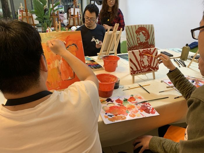 ——團員青年們在專業的美術老師的指導下,構思、描繪愛國情懷的油畫。有毛主席頭像,天安門一景,還有代表廉政文化的蓮花……大家都是第一次畫油畫,繪畫的時候互相觀摩學習,現場氣氛活躍,作品趣味紛呈。經過一個下午描繪,一幅幅作品便躍然紙上。