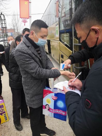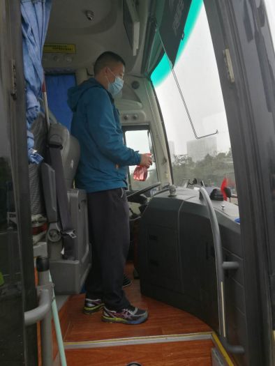 工作人員對大巴全面消毒 返崗人員上車前測量體溫