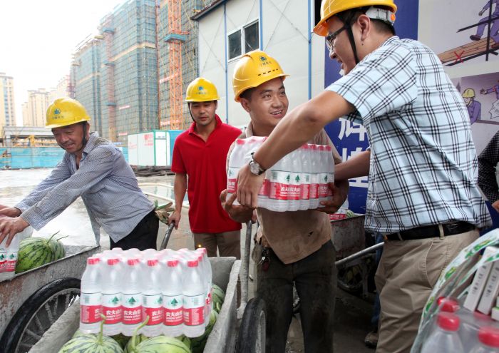 7月16日,寧波住宅建設集團氣象路安置房項目部工人正在領取毛巾、西瓜、飲用水、防暑藥等夏令用品。入伏在即,集團公司領導到所屬的30余個項目部開展“送清涼進工地”活動,并落實露天作業“做兩頭歇中間”的避高溫作息措施。