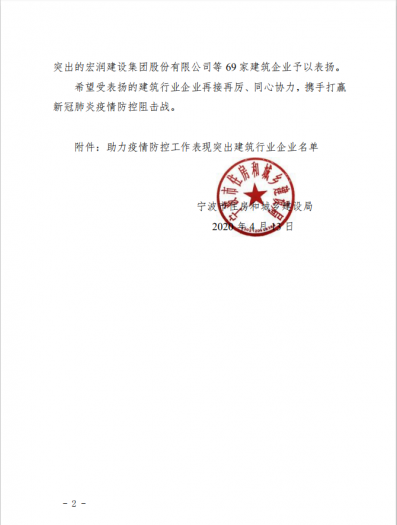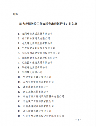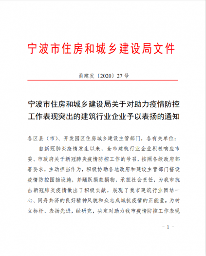 4月13日,寧波市住房和城鄉建設局印發《關于對助力疫情防控工作表現突出的建筑行業企業予以表揚的通知》,通報表揚69家建筑企業。